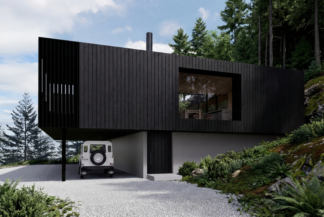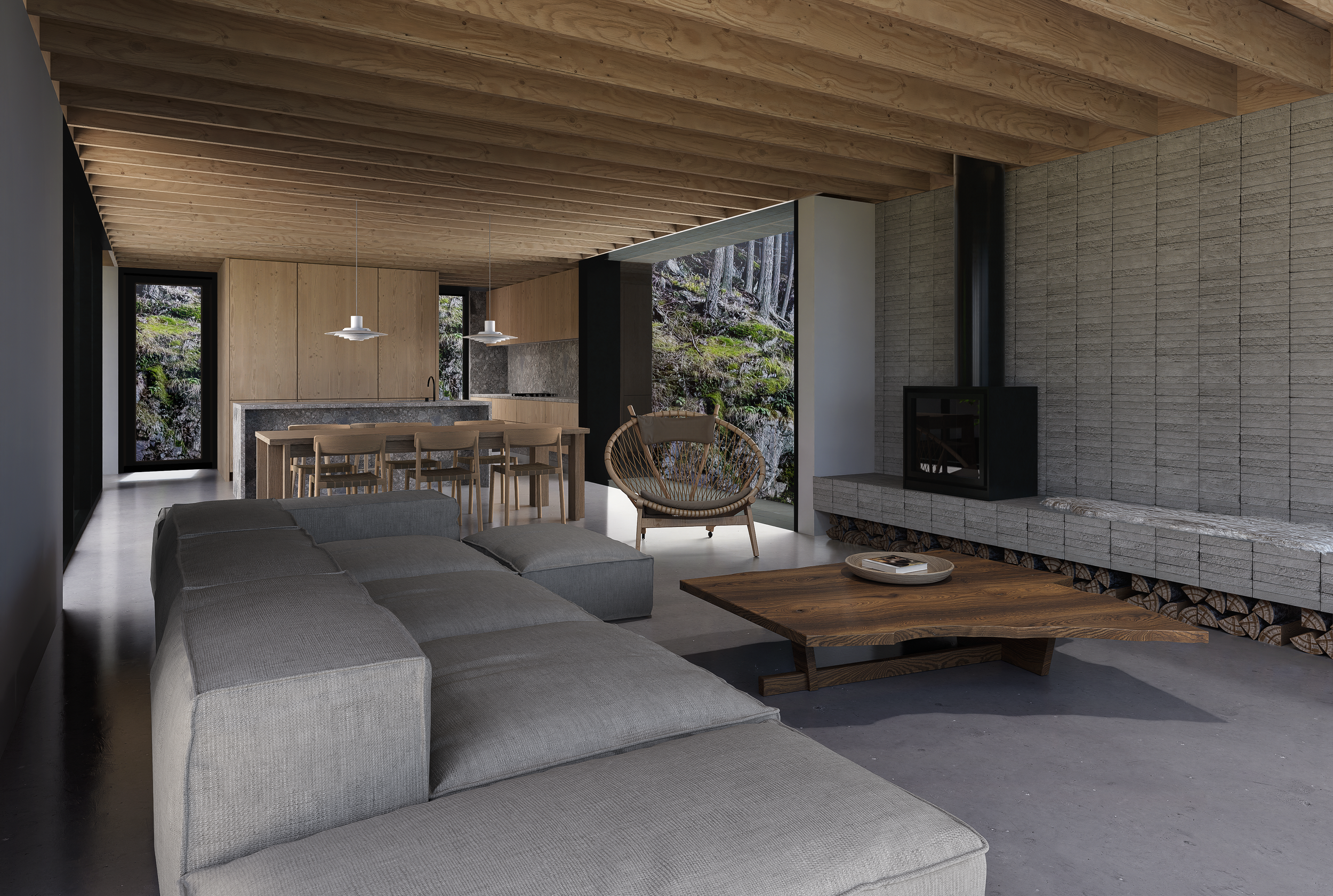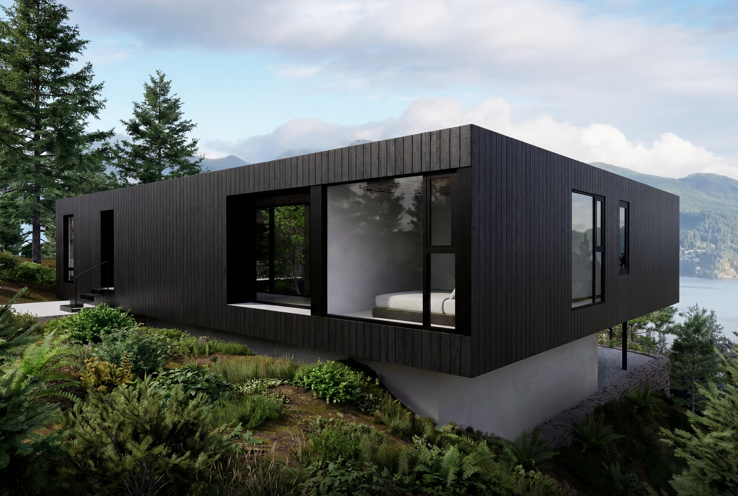 Materiality is grounded and tactile, drawing directly from the surrounding environment. Charred wood siding (shou sugi ban), concrete, and natural finishes establish a quiet, enduring palette. Inside, exposed Douglas fir rafters and custom millwork bring warmth and craft to the spaces, reinforcing a sense of authenticity and permanence.